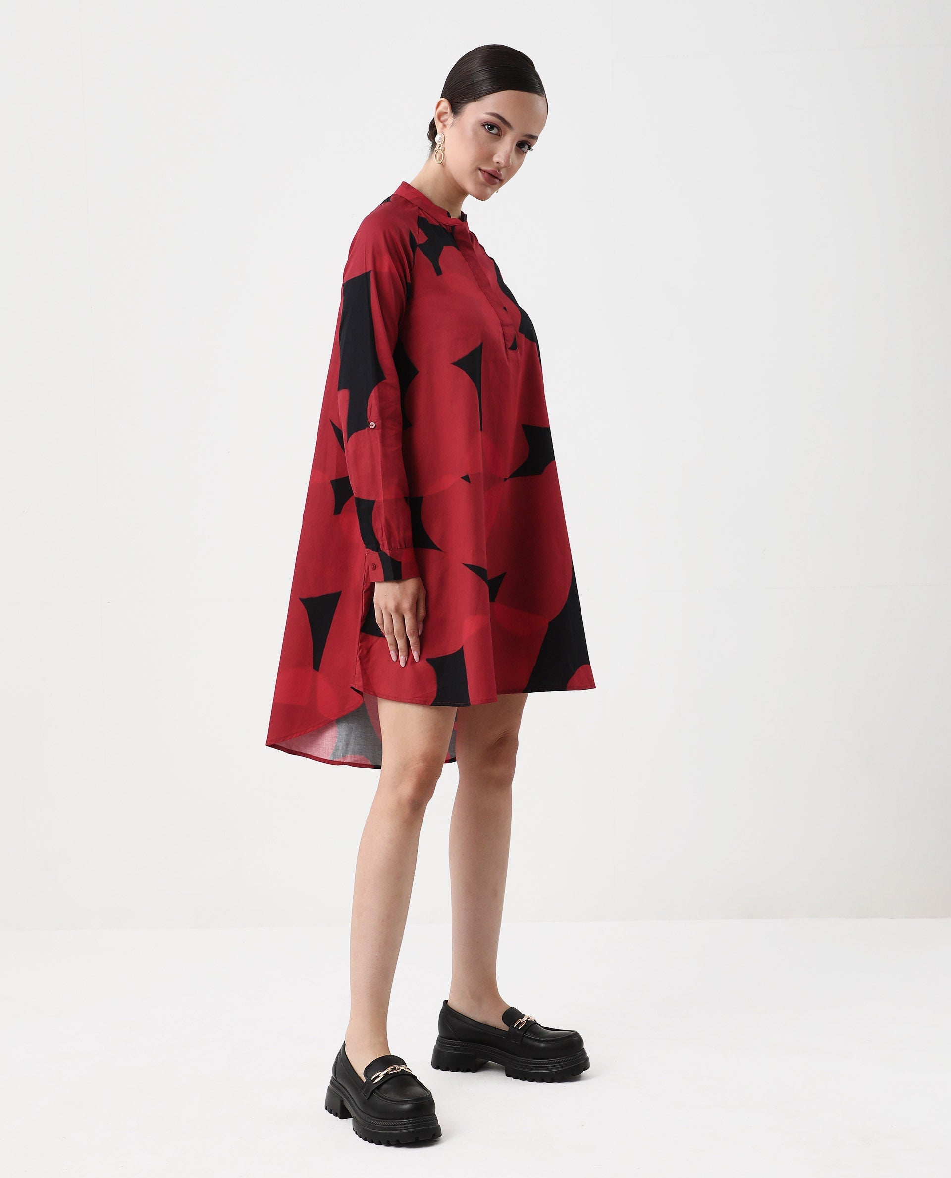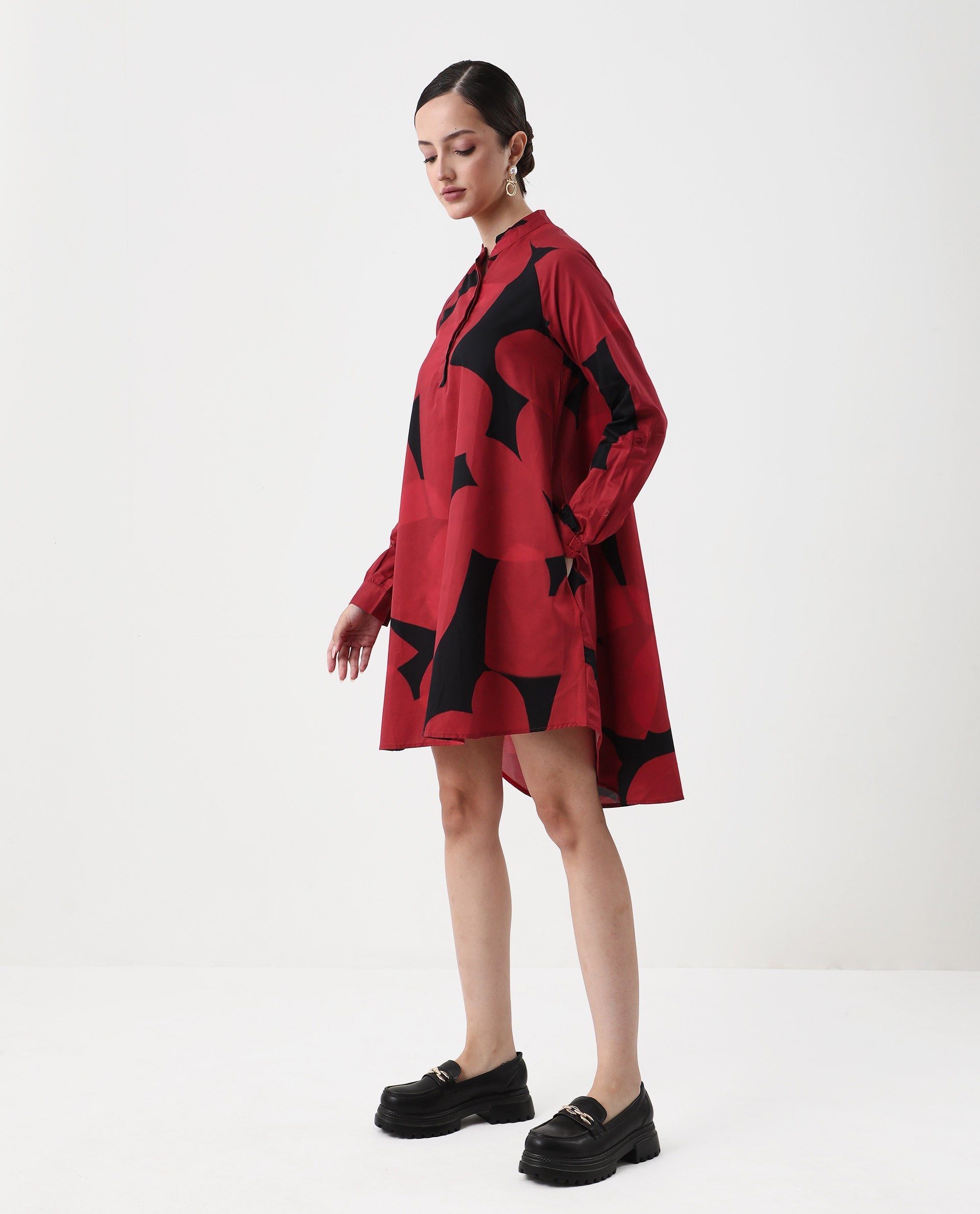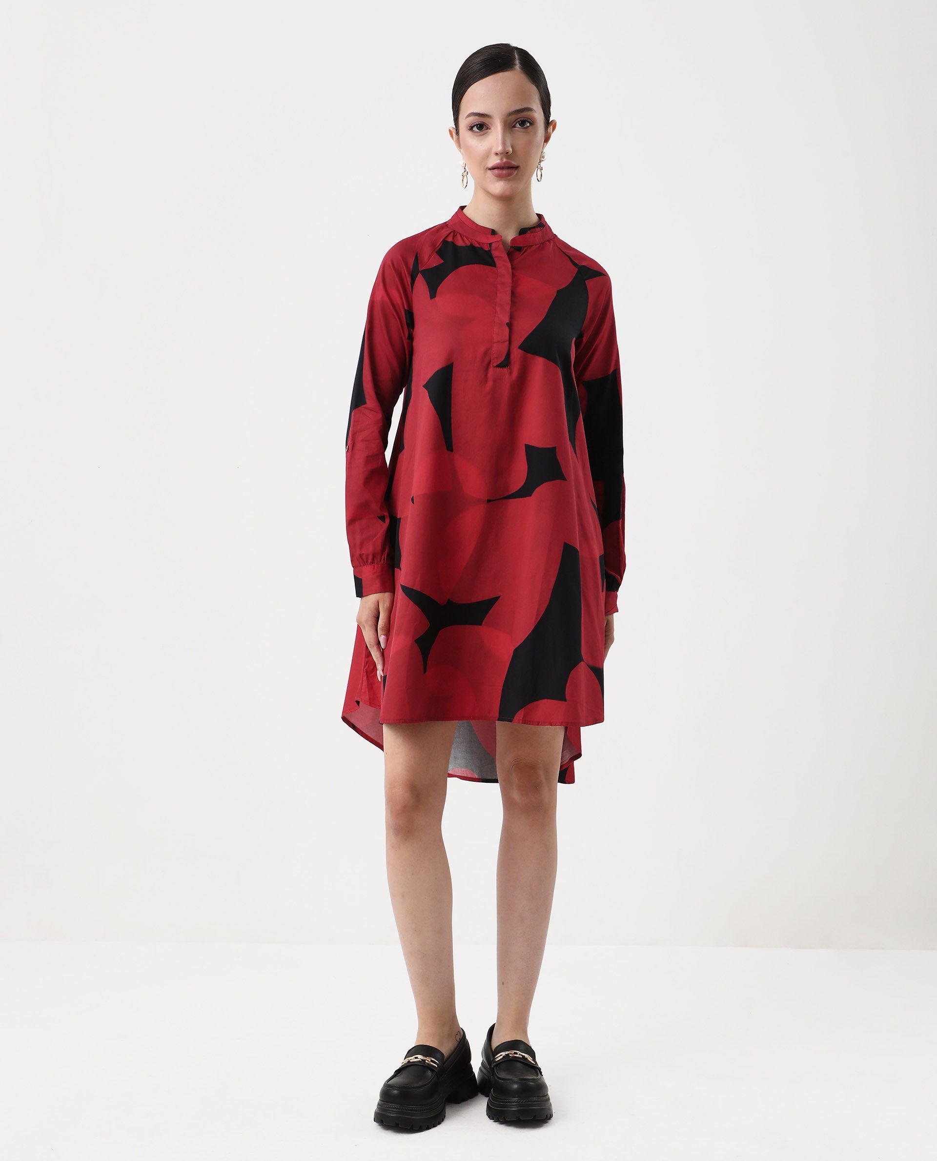 Rareism Women's Jioplo Black Cotton Blend Mandarin Collar Object Print Raglan Sleeve Mini Flared Top