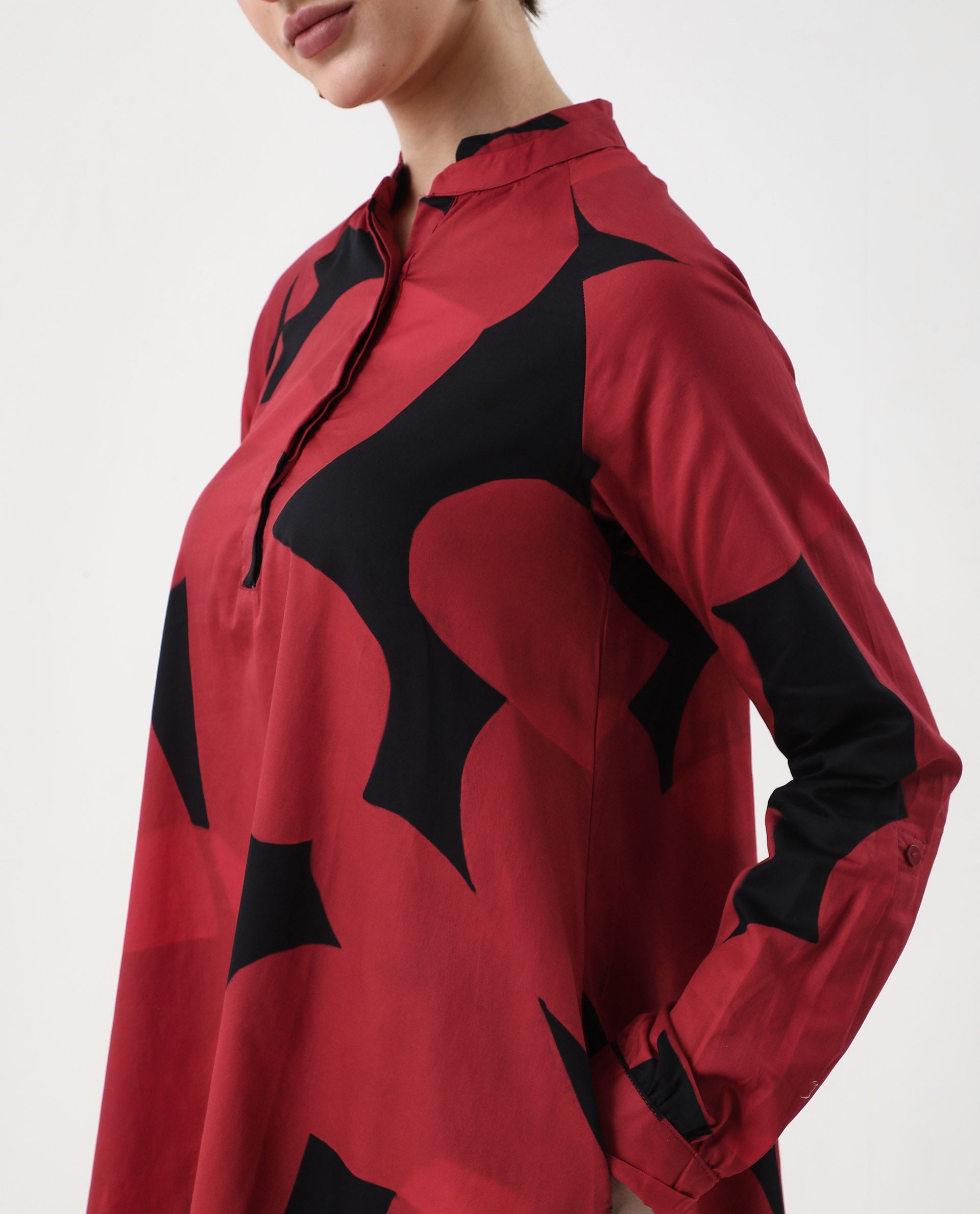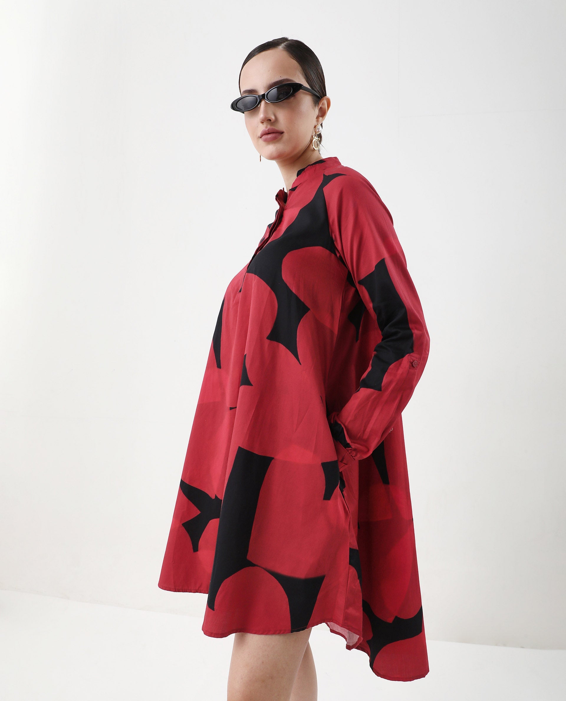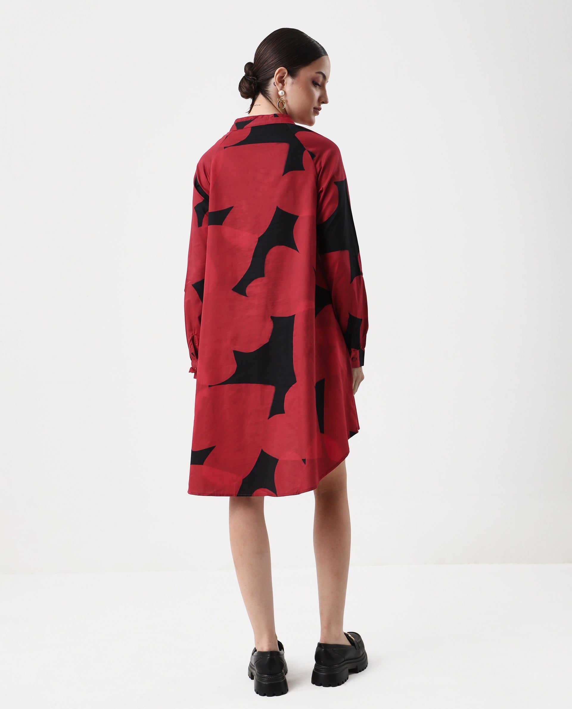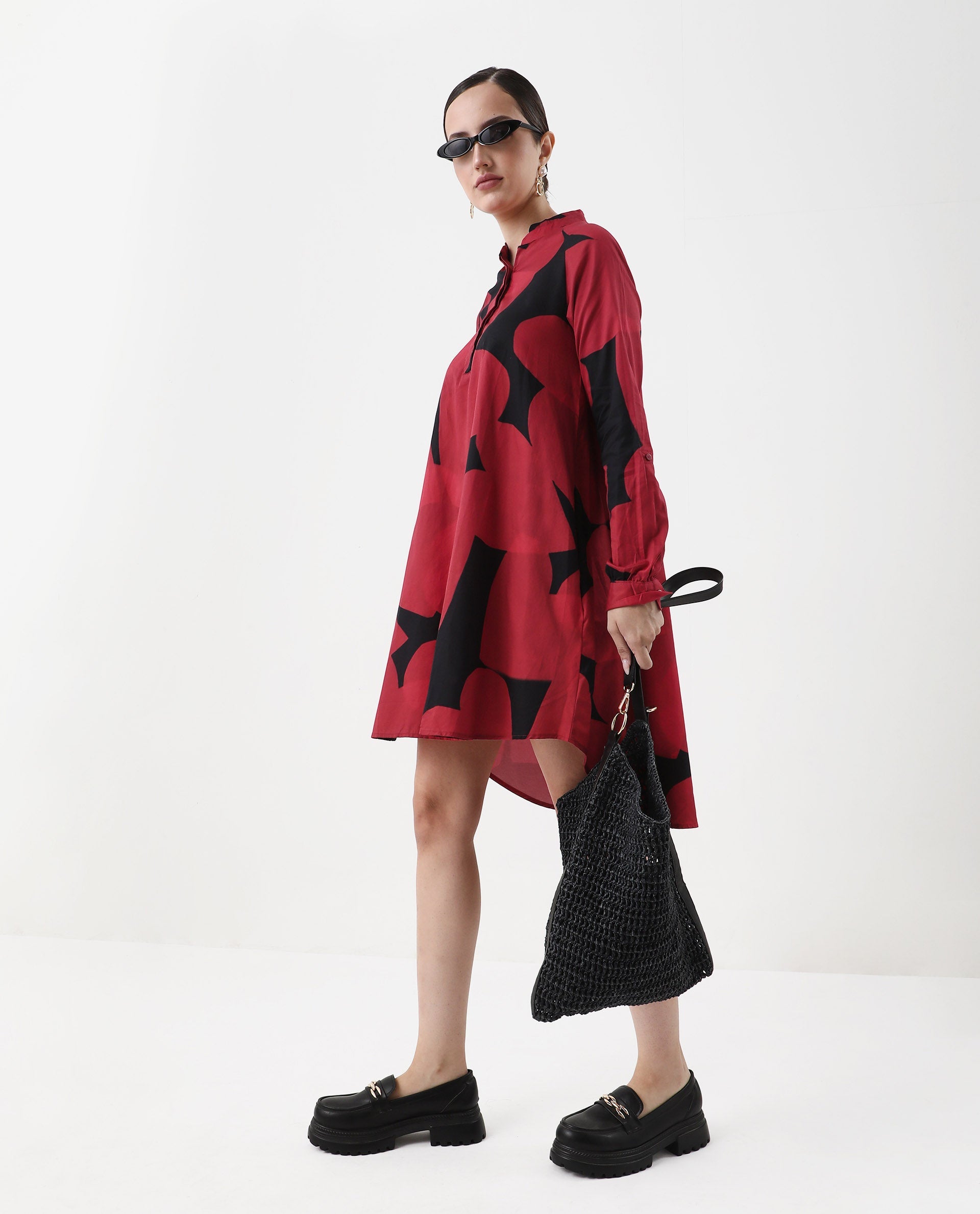 Rareism Women's Jioplo Black Cotton Blend Mandarin Collar Object Print Raglan Sleeve Mini Flared Top