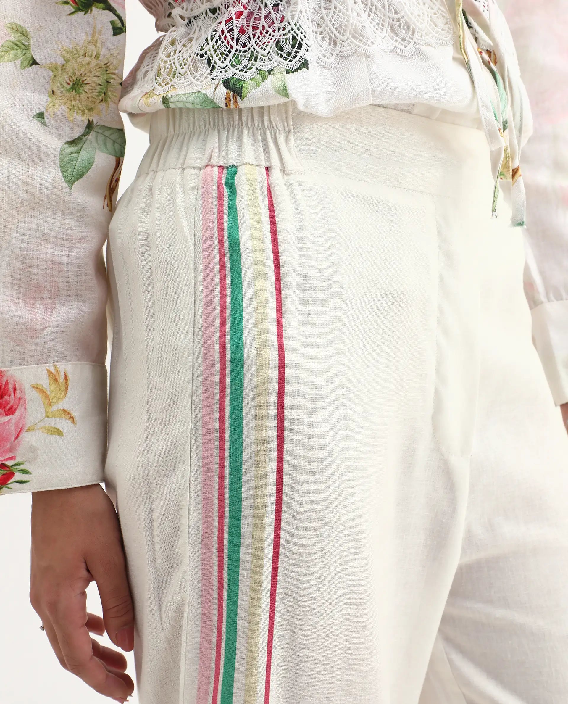 Rareism Women's Banche-B Off White Cotton Blend Floral Print Ankle Length Straight Fit Trouser