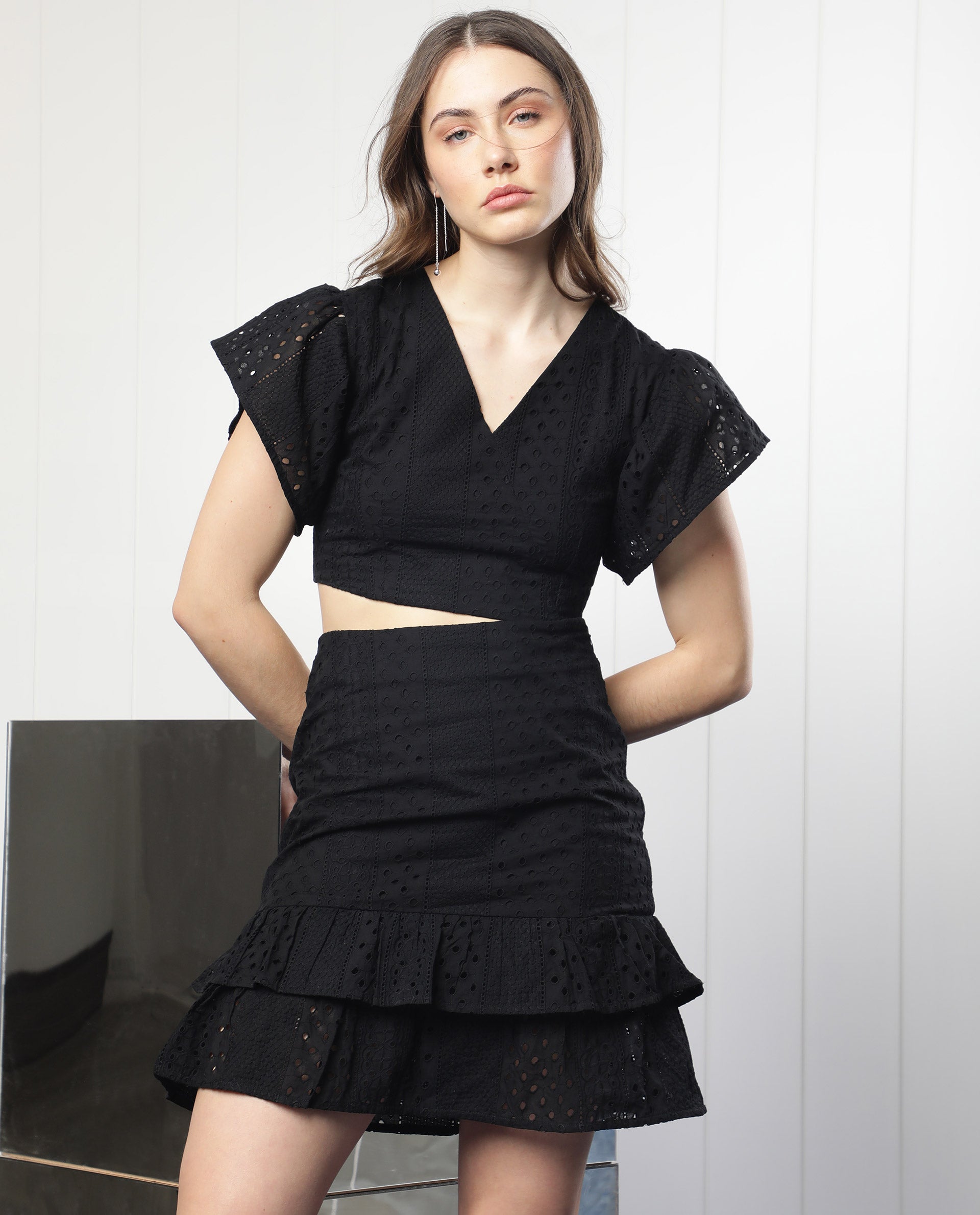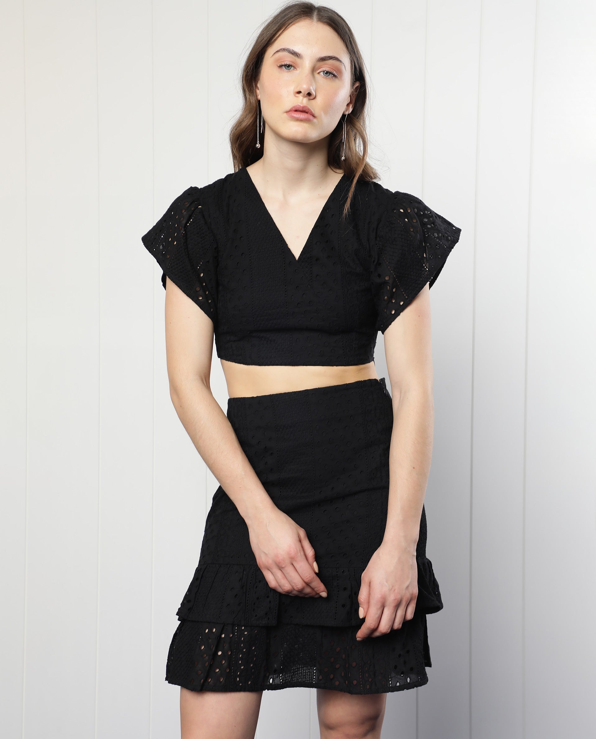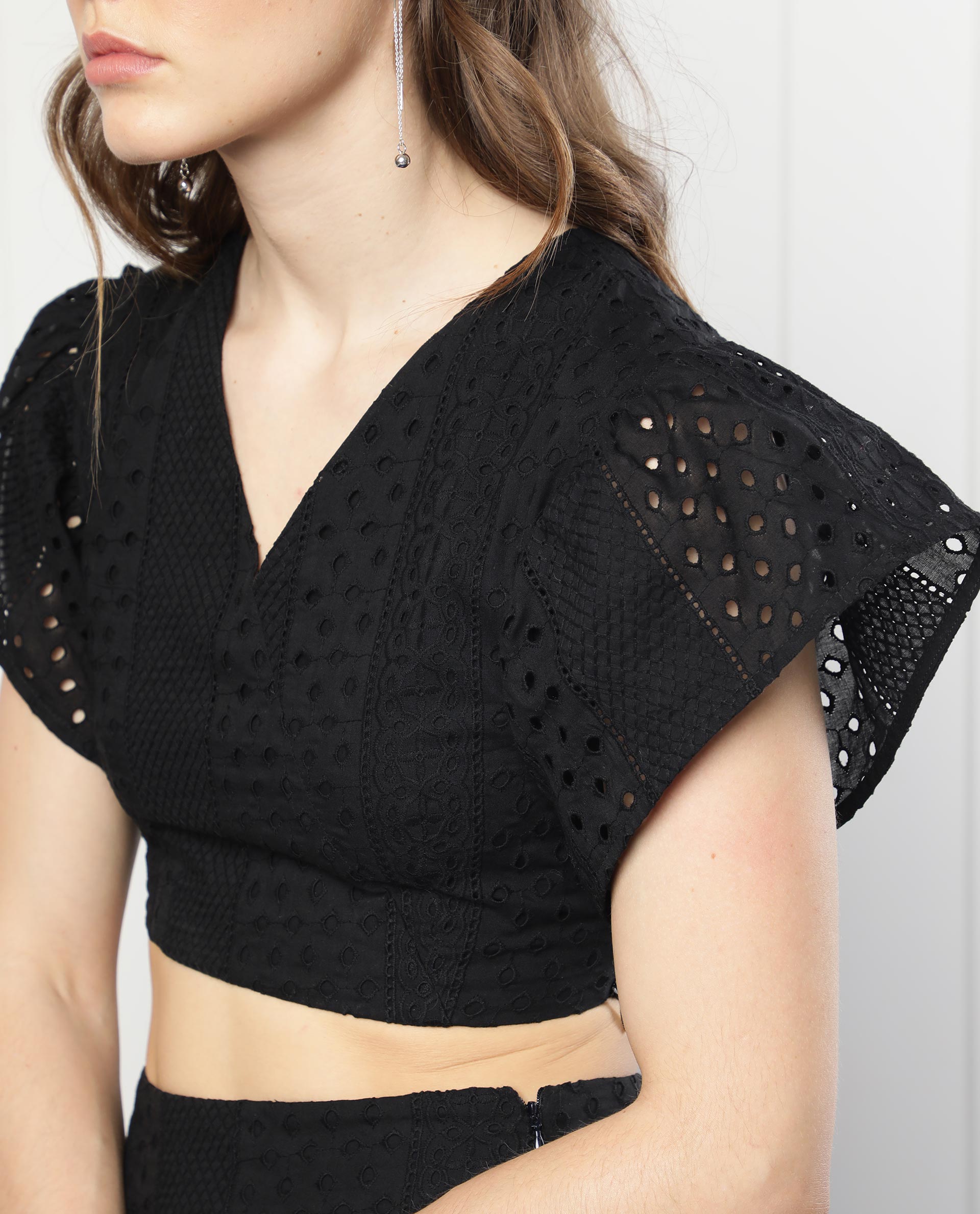 The model (Chest-34, Waist-28, Hips-38, Height-178 cms) is wearing a size XS.
