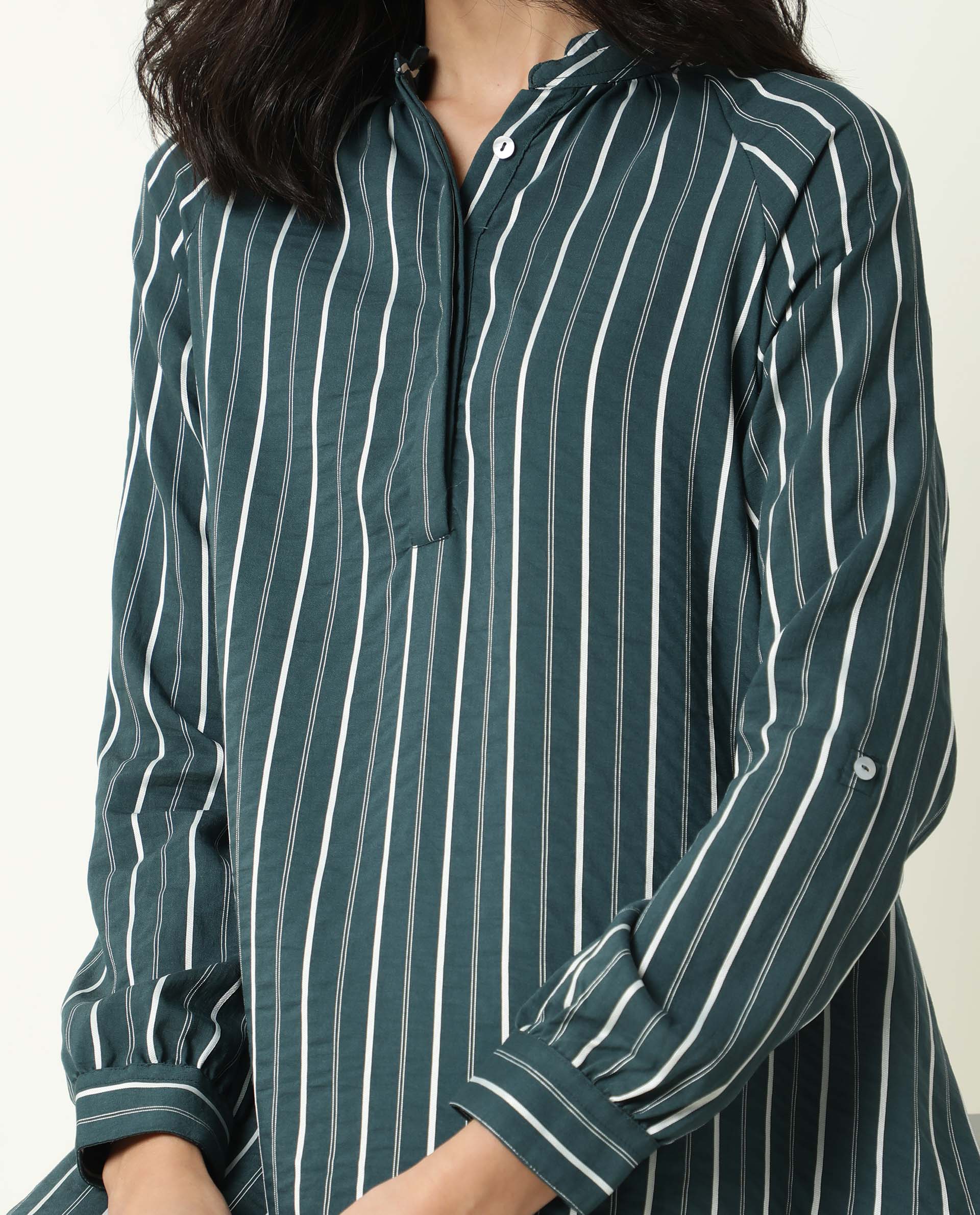 STRIPED MANDARIN COLLAR FLARED DRESS