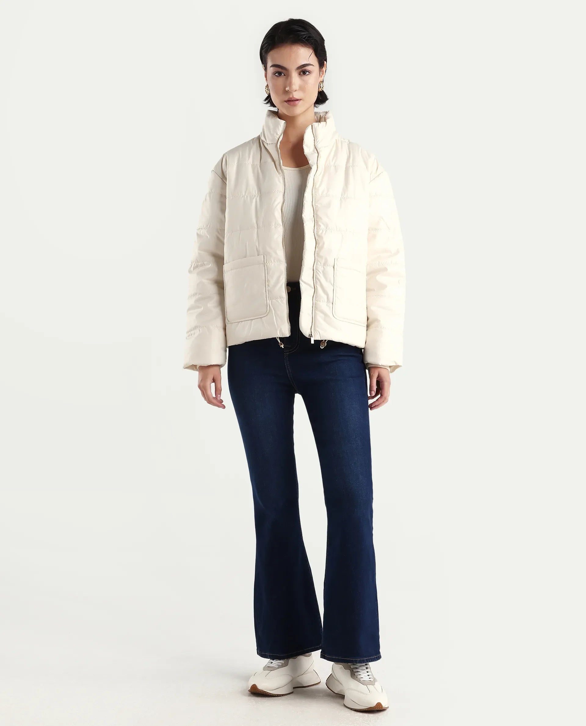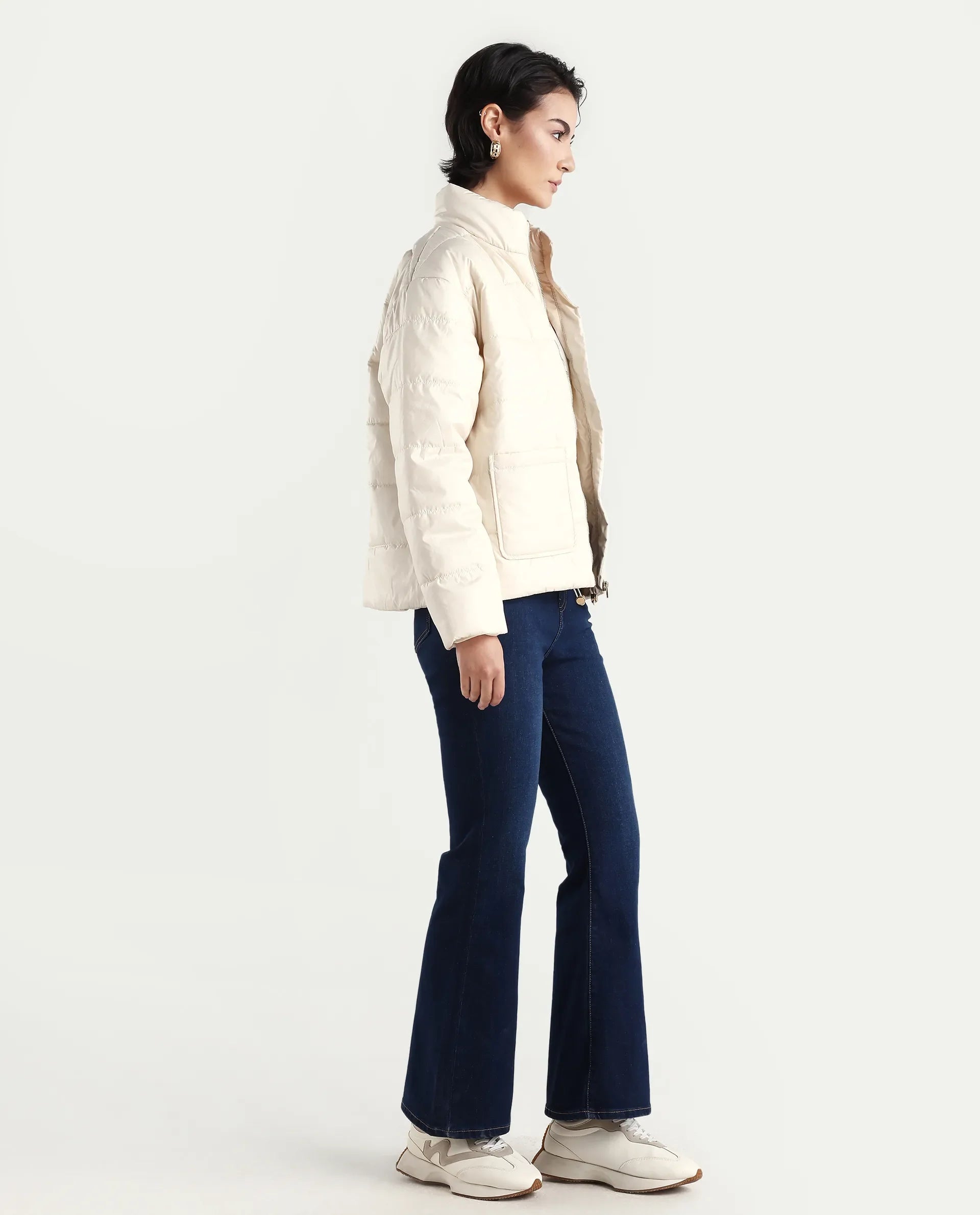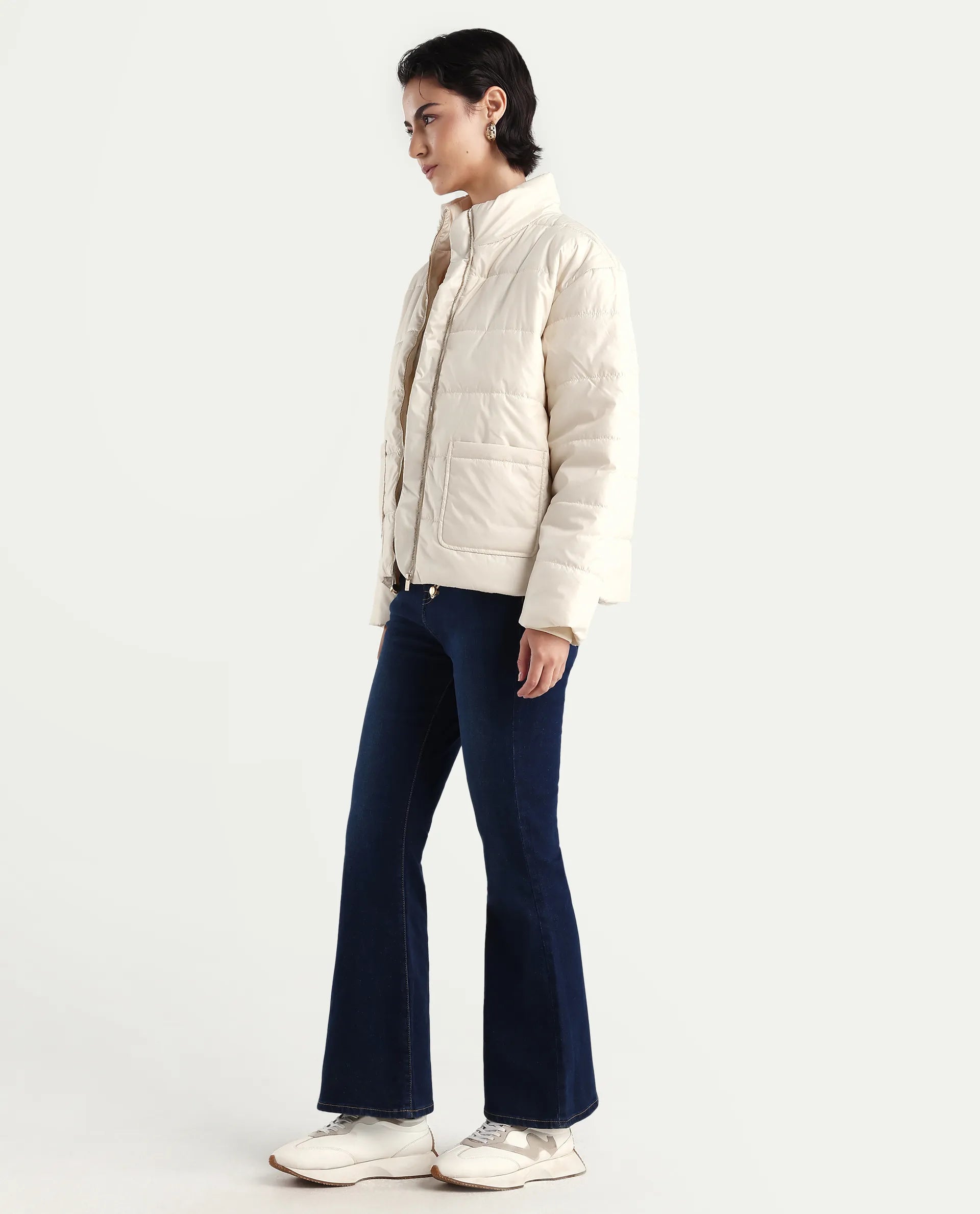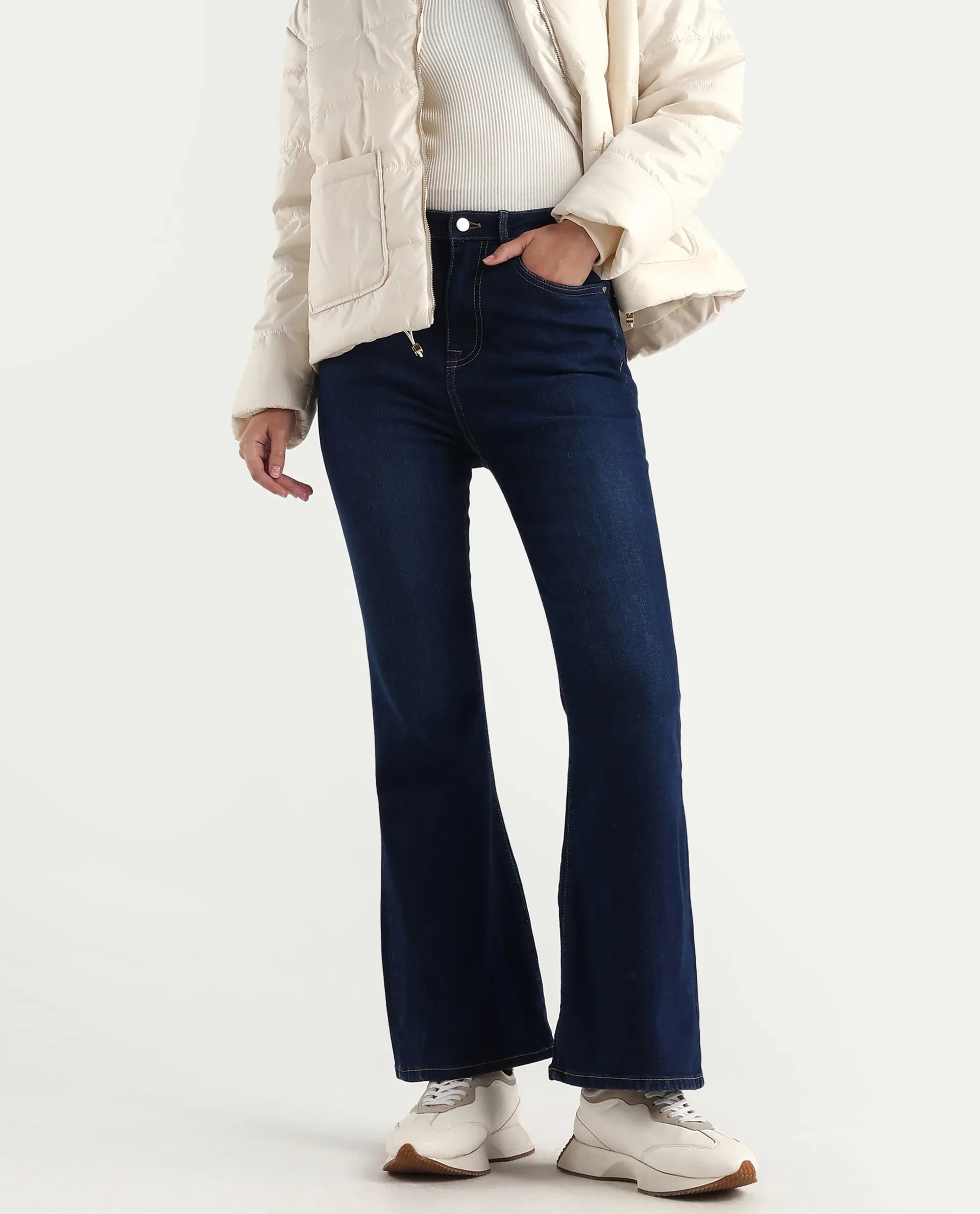 Rareism Women's Denfa Dark Blue Bootcut Jeans combine classic style with comfort, crafted from a soft cotton blend fabric for durability and breathability. The bootcut design flatters various body types, offering a balanced silhouette that pairs well with boots or heels. Their plain dark blue wash lends versatility, making these jeans suitable for both casual and semi-formal occasions. Ideal for those seeking a timeless wardrobe staple that delivers both fit and function.