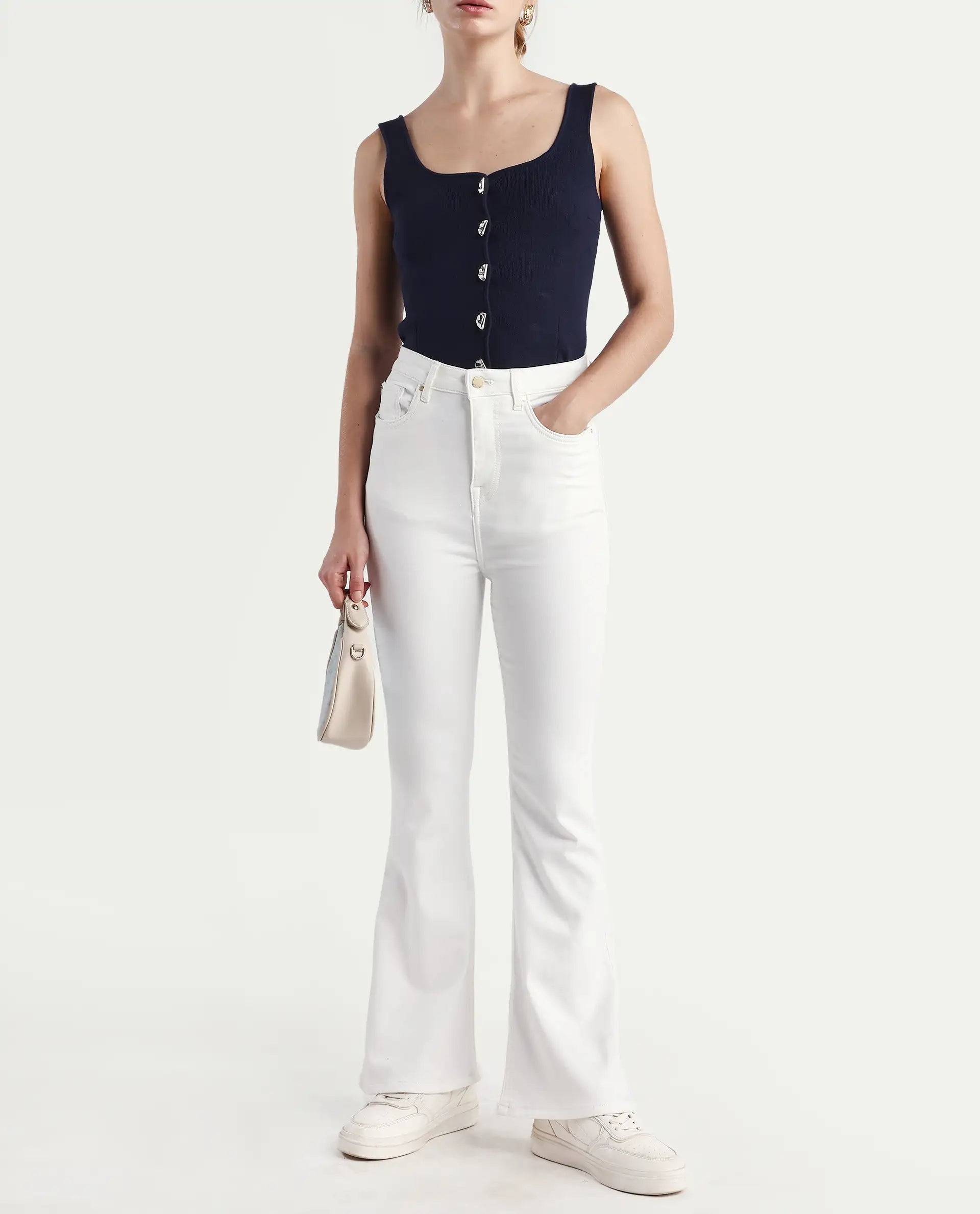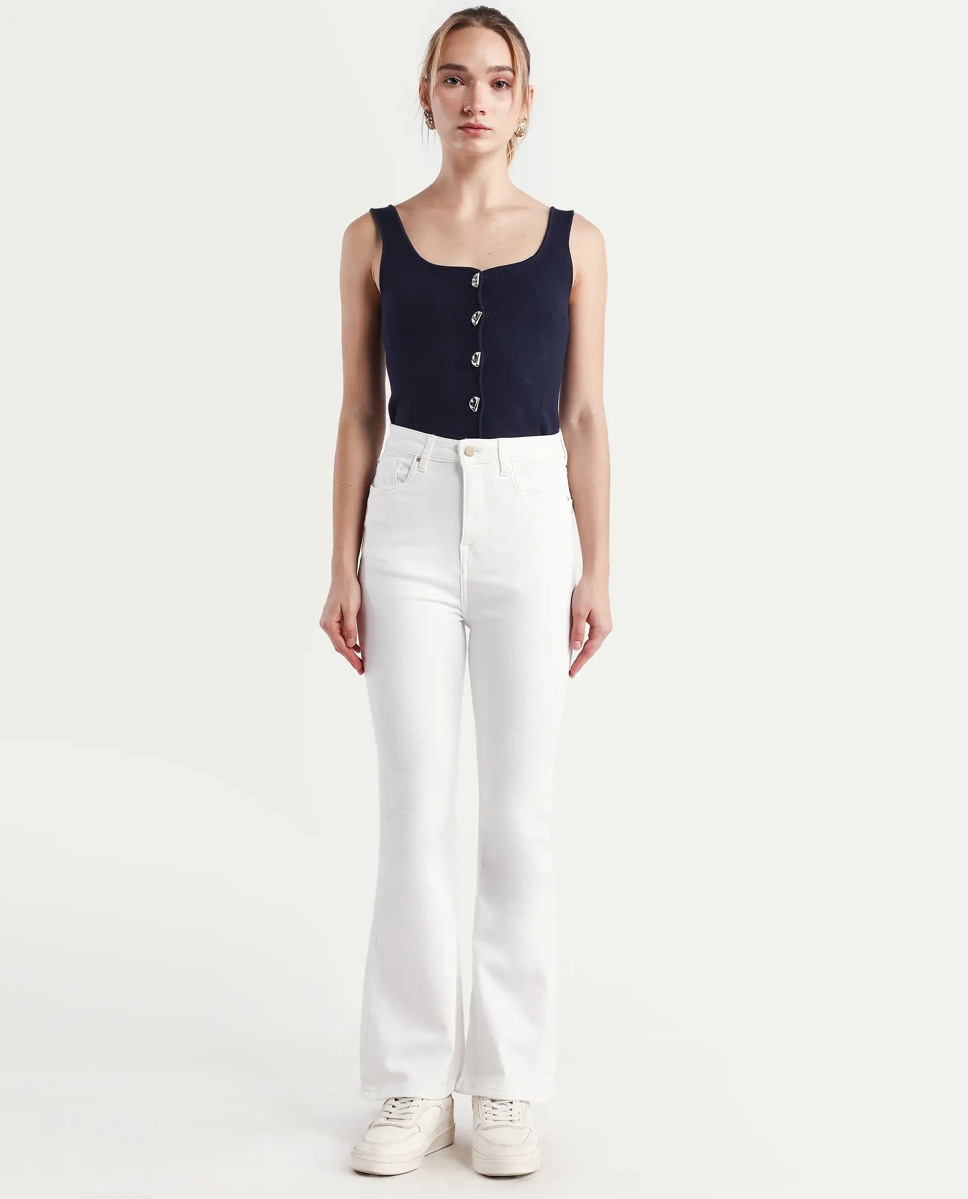 Rareism Women's Denro White Cotton Blend Bootcut Plain Jeans offer a perfect blend of comfort and style. Crafted from a soft cotton blend fabric, these jeans ensure breathability and durability for everyday wear. The bootcut design provides a flattering silhouette that pairs effortlessly with various footwear styles, making them versatile for casual or semi-formal occasions. Their plain white finish adds a clean, timeless touch to your wardrobe essentials. Ideal for those seeking a reliable denim option with refined tailoring and long-lasting comfort.
