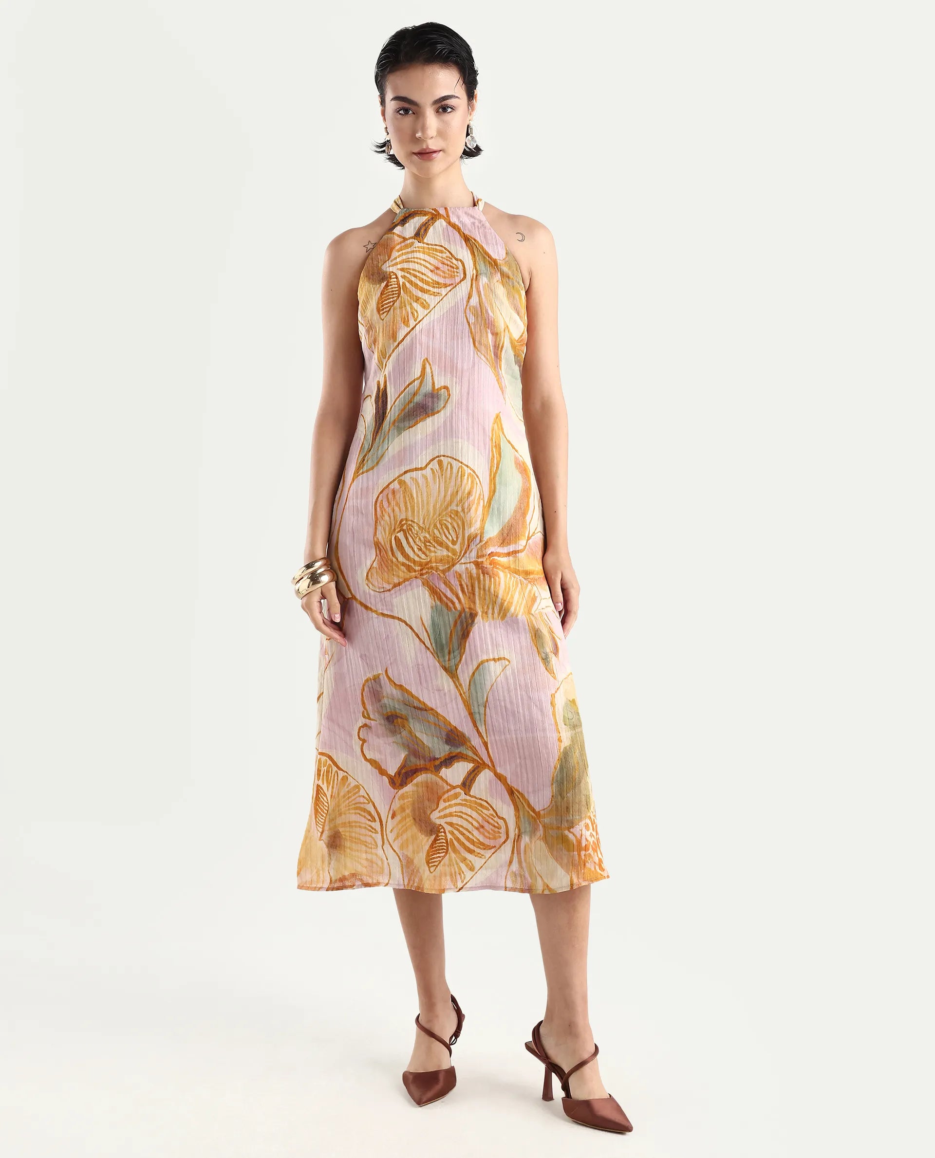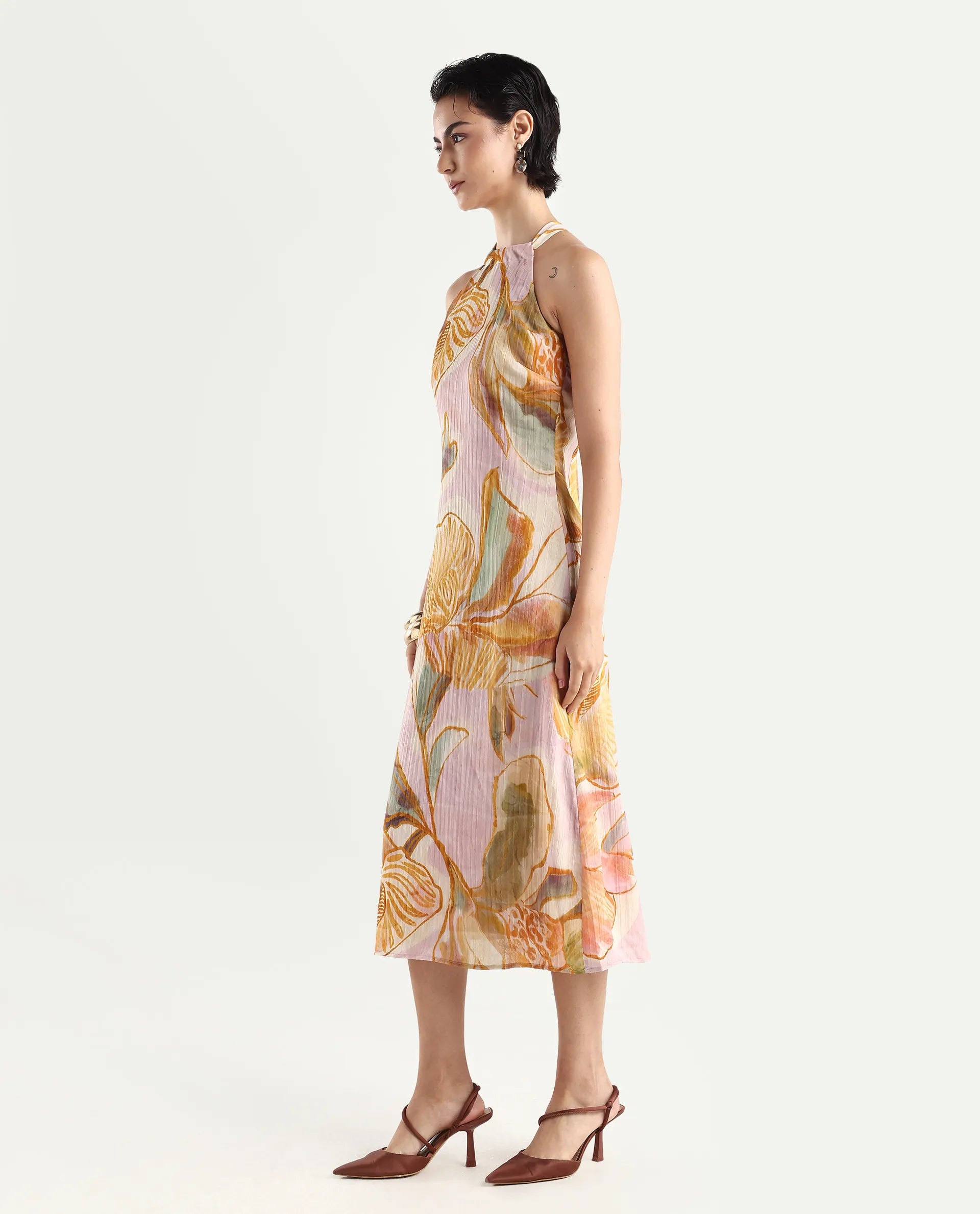 PRINTED HALTER NECK A-LINE MIDI DRESS