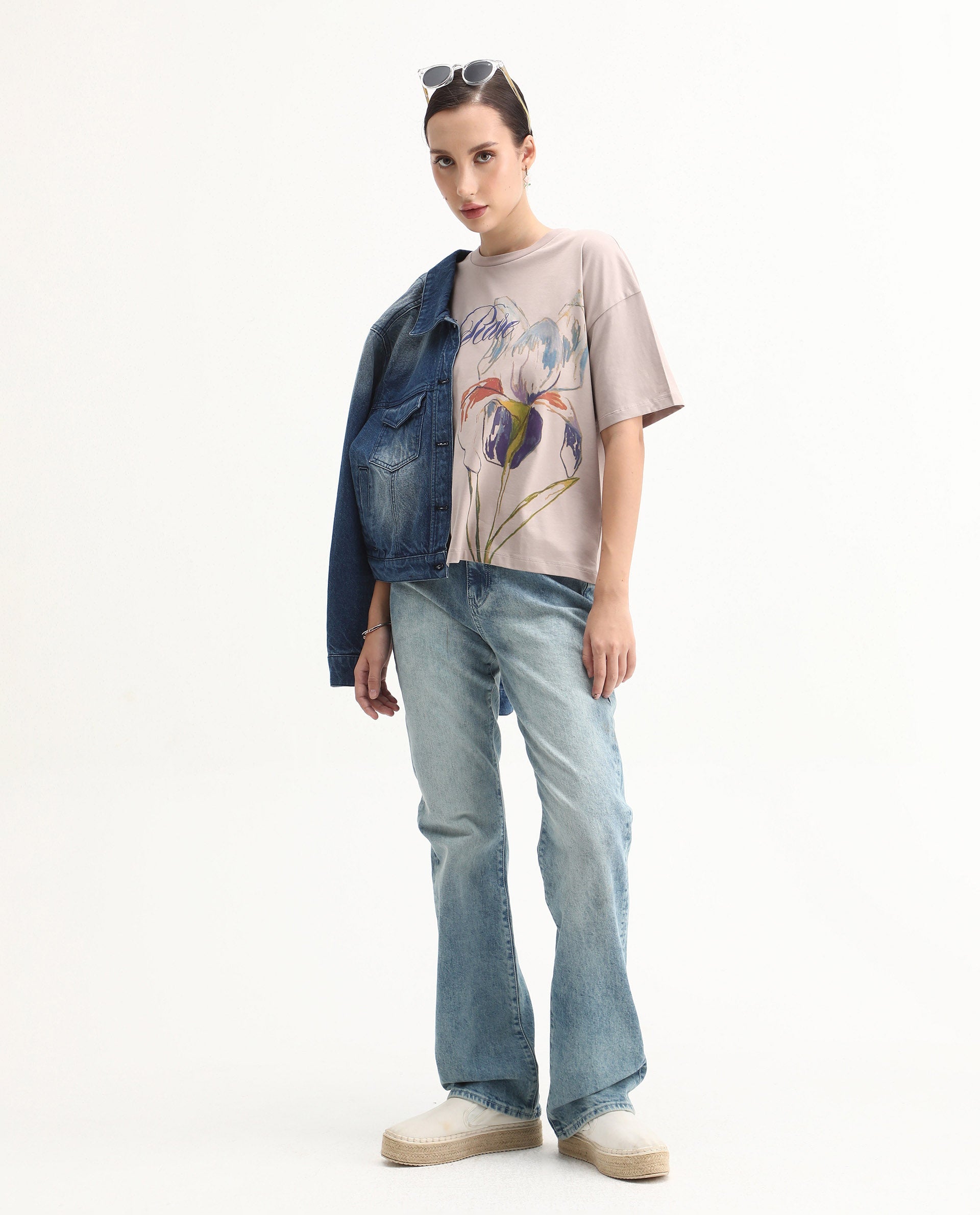 Rareism Women's Fero Beige Cotton Blend Crew Neck Relaxed Fit T-Shirt