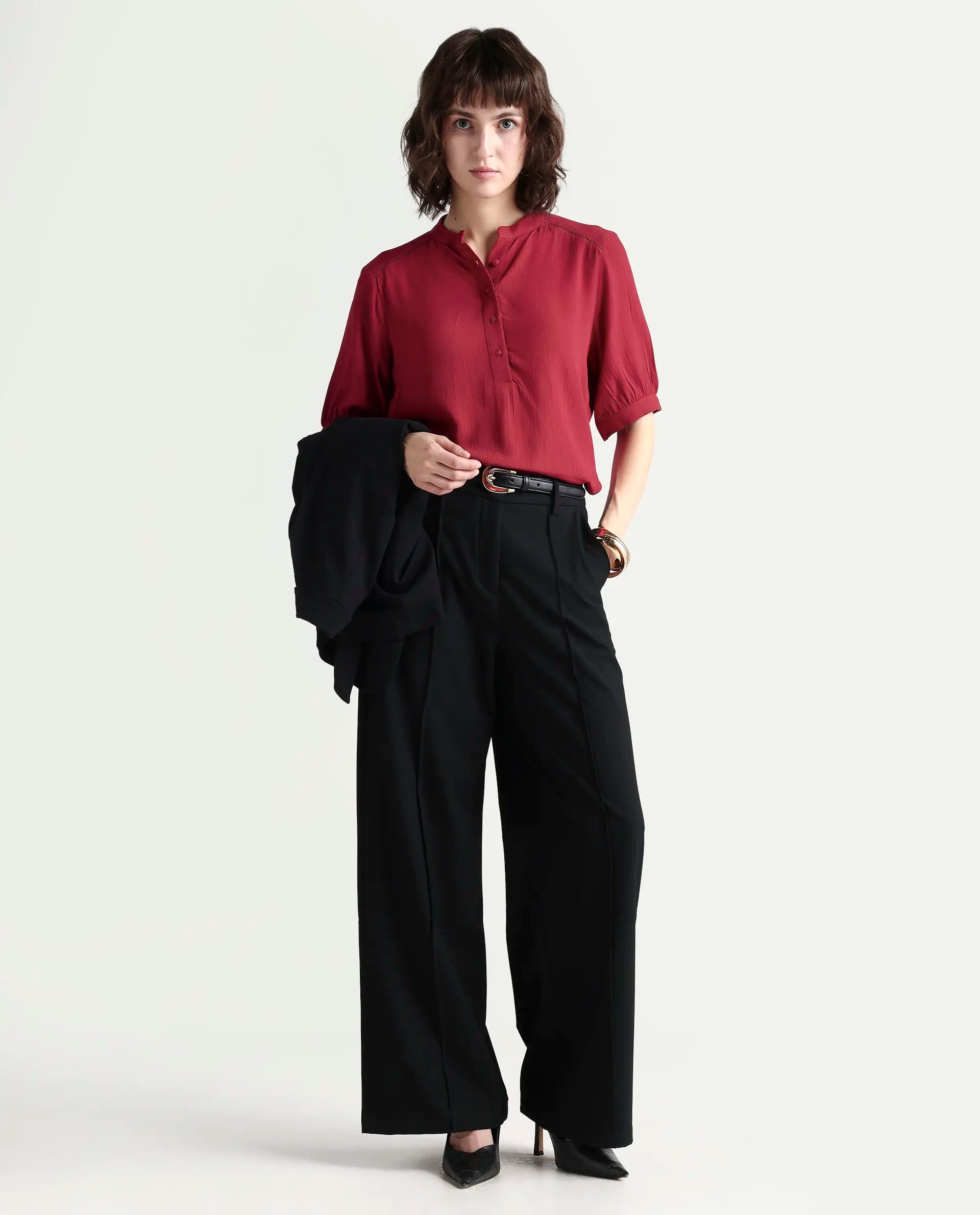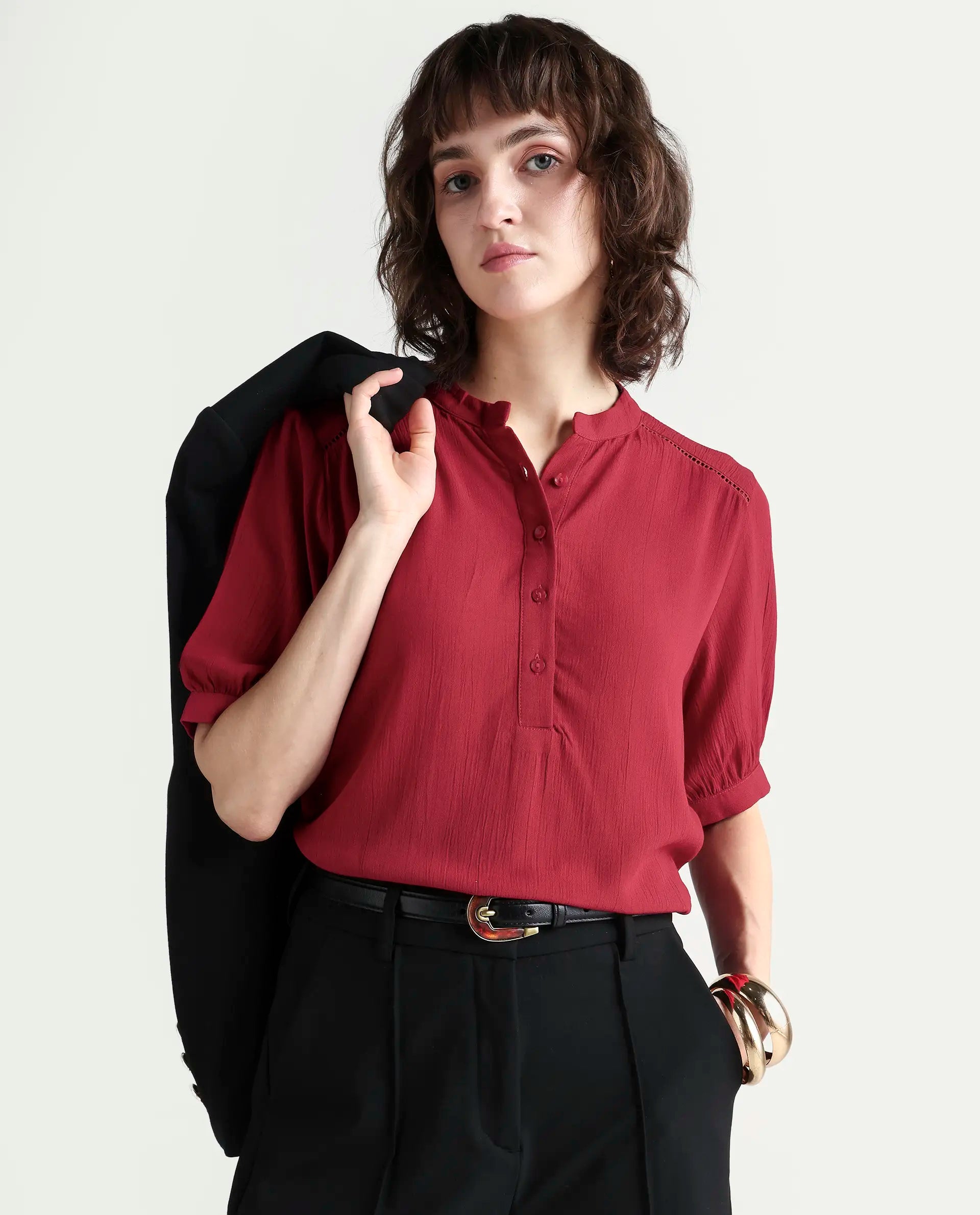 Crafted from premium viscose, the Elane top delivers exceptional breathability and a luxuriously soft drape against the skin. The half-sleeve design offers versatile styling for transitional seasons, while the regular fit provides comfortable, flattering coverage without excess fabric. The rich red hue makes a sophisticated statement, easily pairing with neutrals or complementary tones. Perfect for both casual outings and professional settings, this plain top serves as a wardrobe essential that transitions seamlessly from day to evening wear.