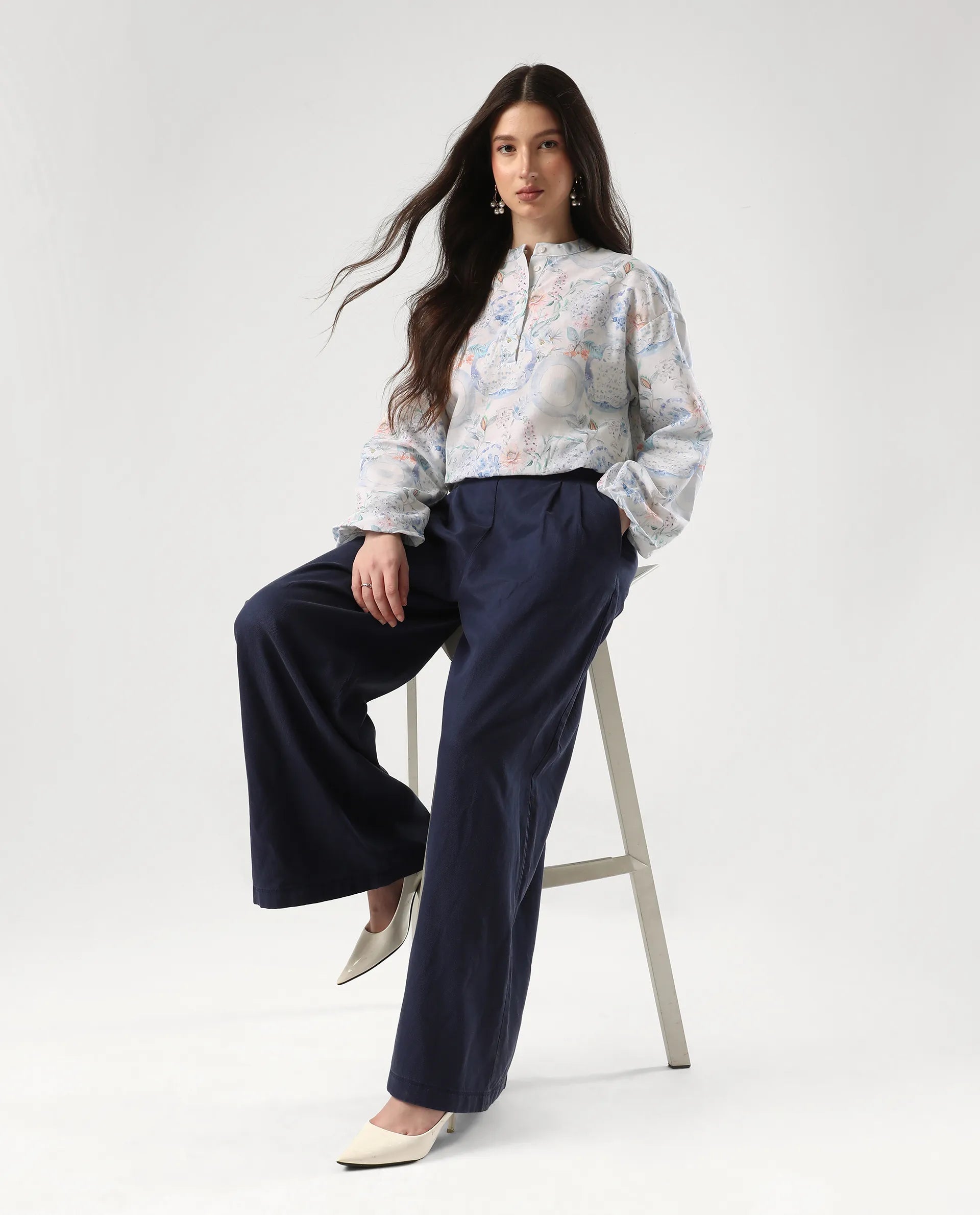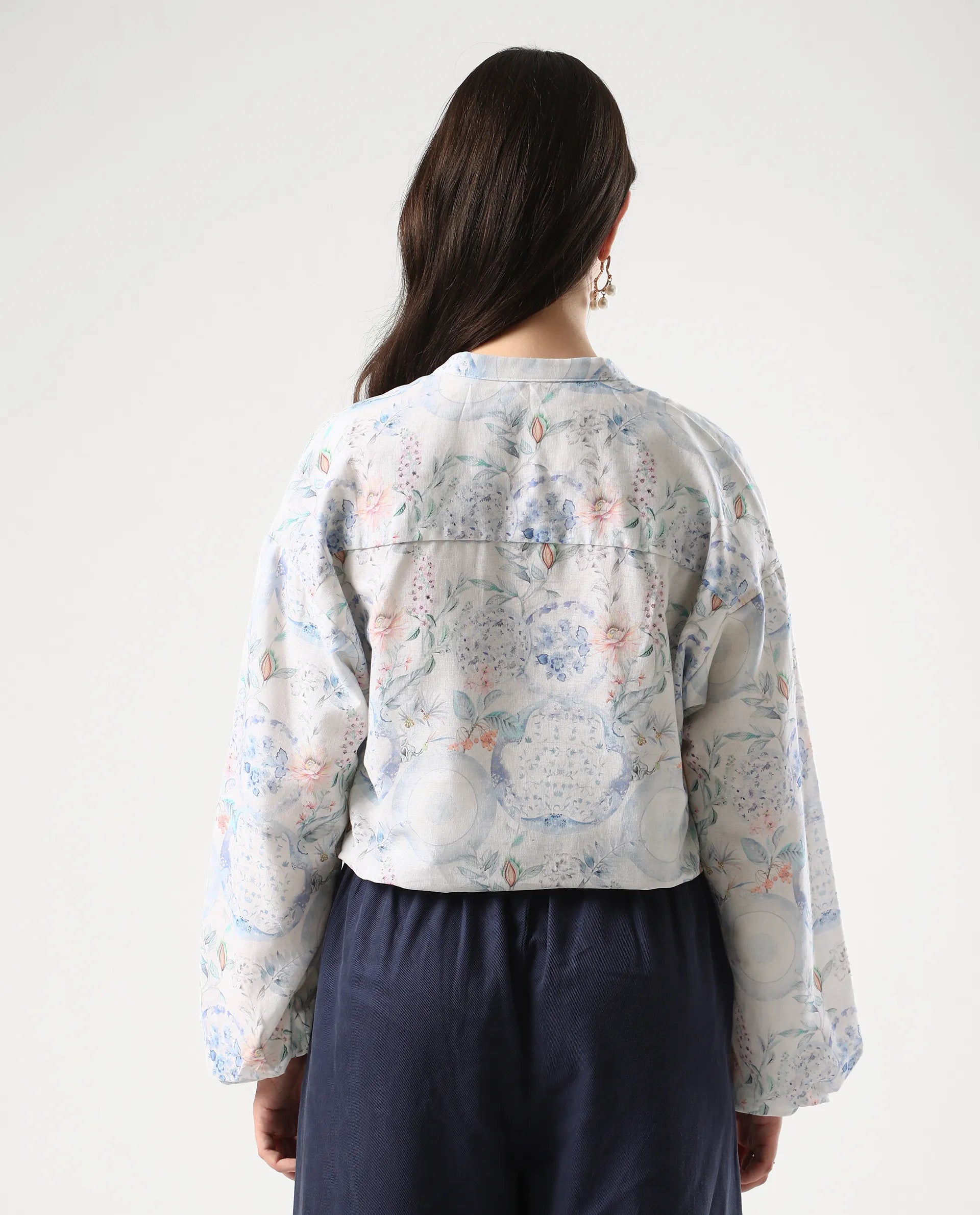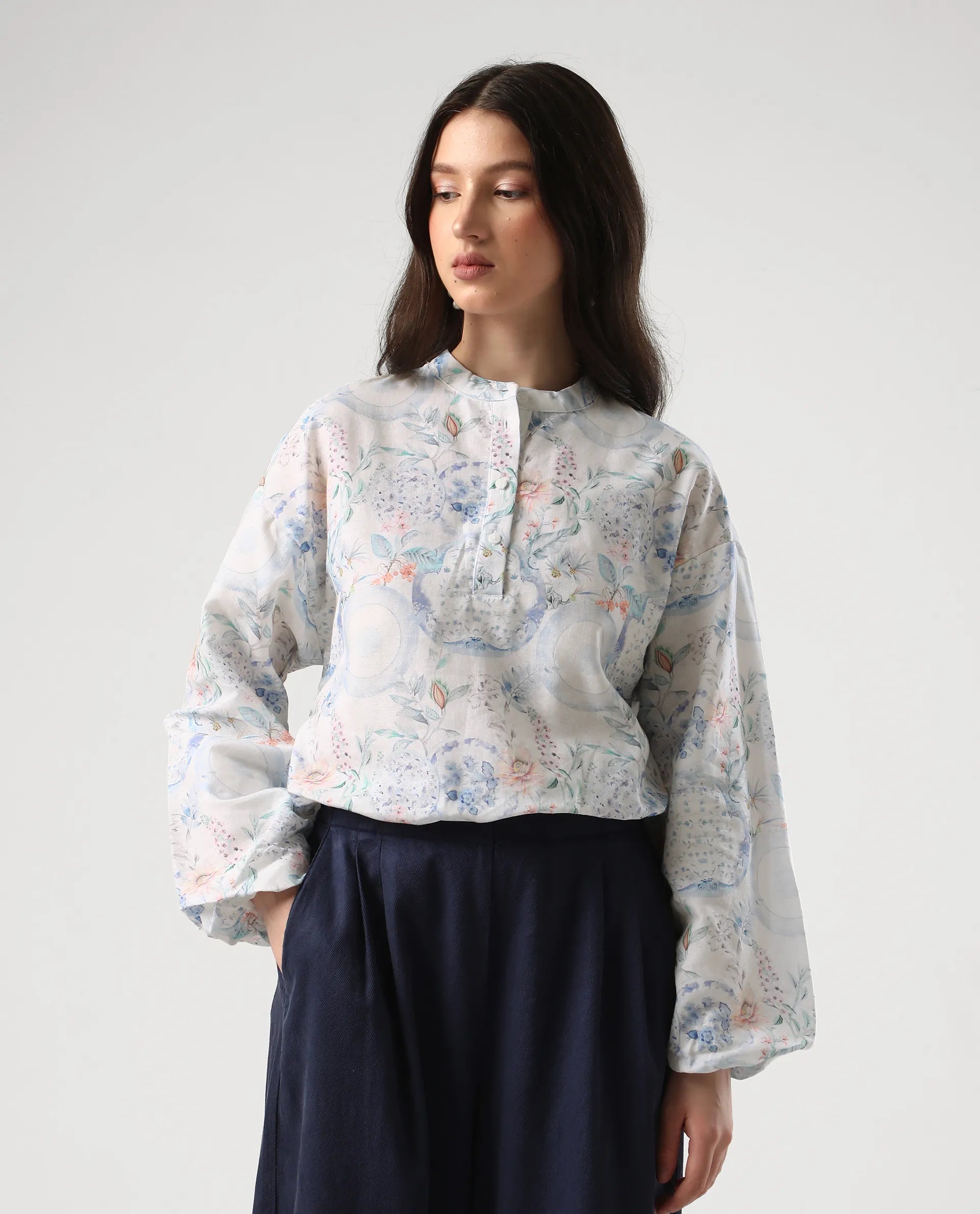 Rareism Women's Premer T Multi Cotton Blend Mandarin Collar Abstract Print Balloon Sleeve Regular Fit Top