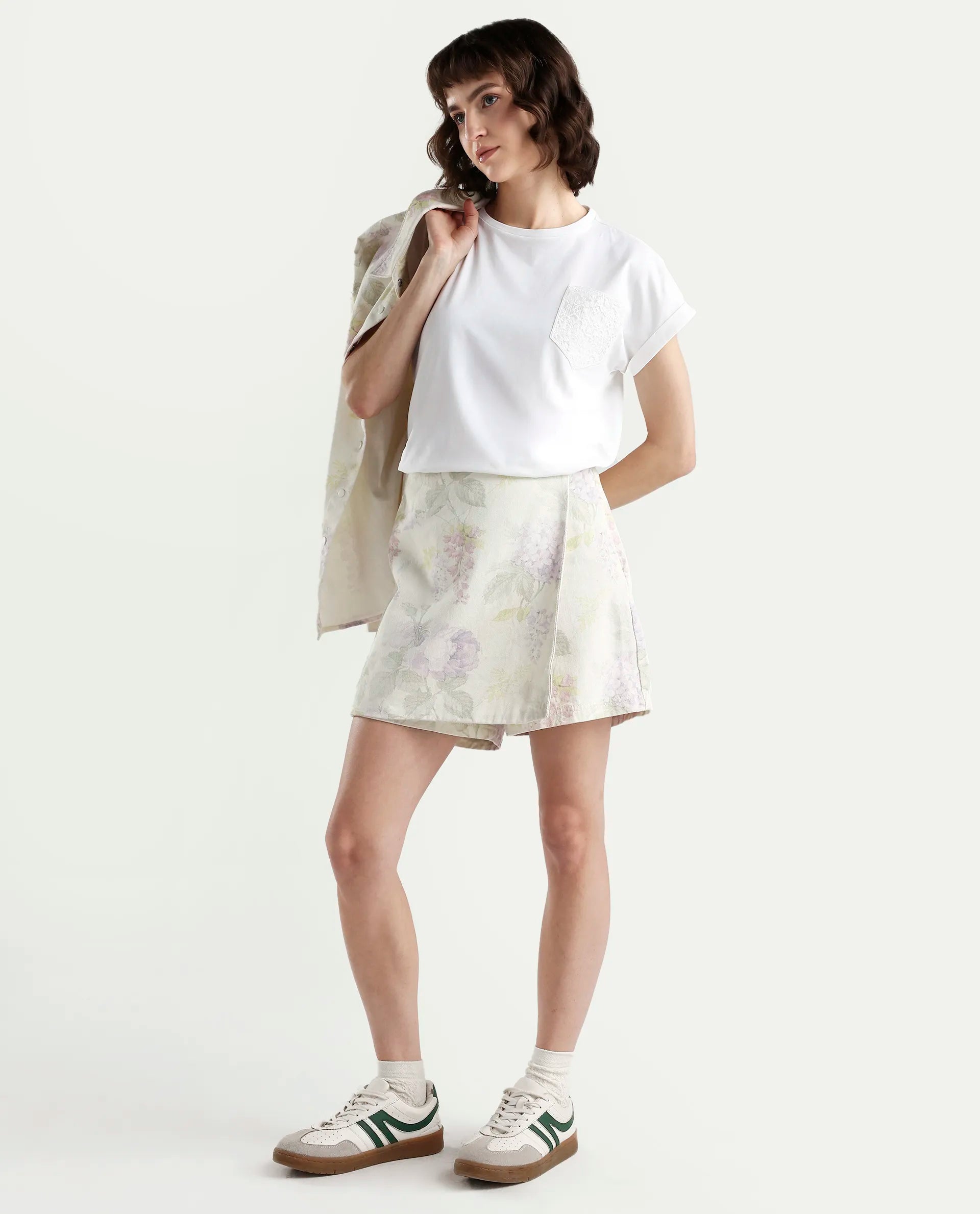 - The model (Chest-34, Waist-28, Hips-38, Height-178 cms) is wearing a size XS.