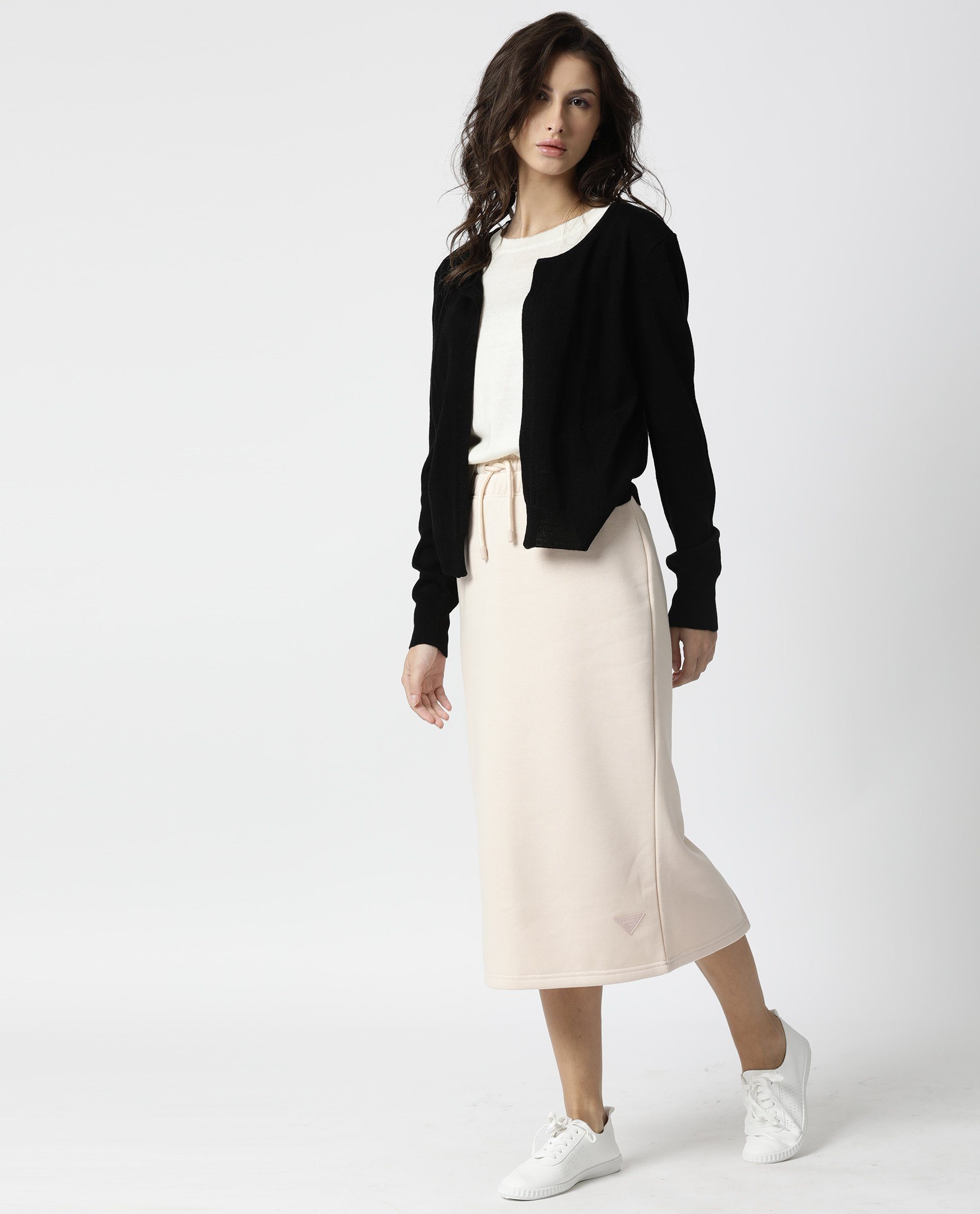 - A double layered sweater top with a sleeveless underlayer in white and a front open overlayer in black.