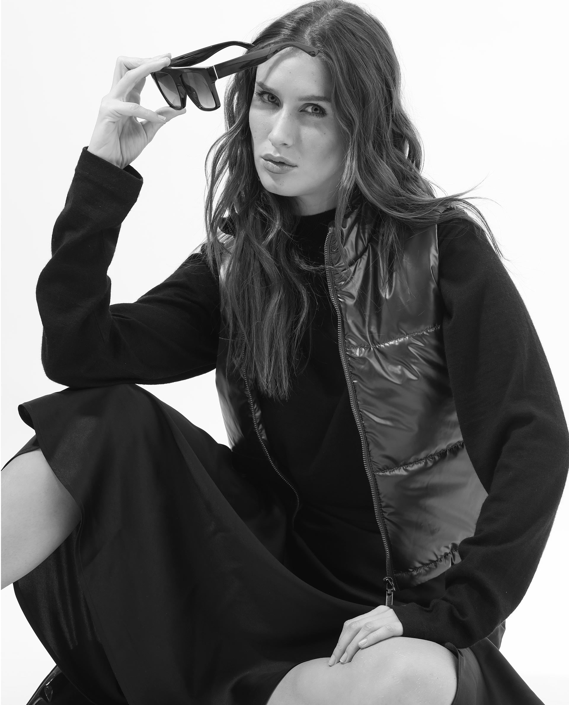 The model (Chest-34, Waist-28, Hips-38, Height-178 cms) is wearing a size XS.