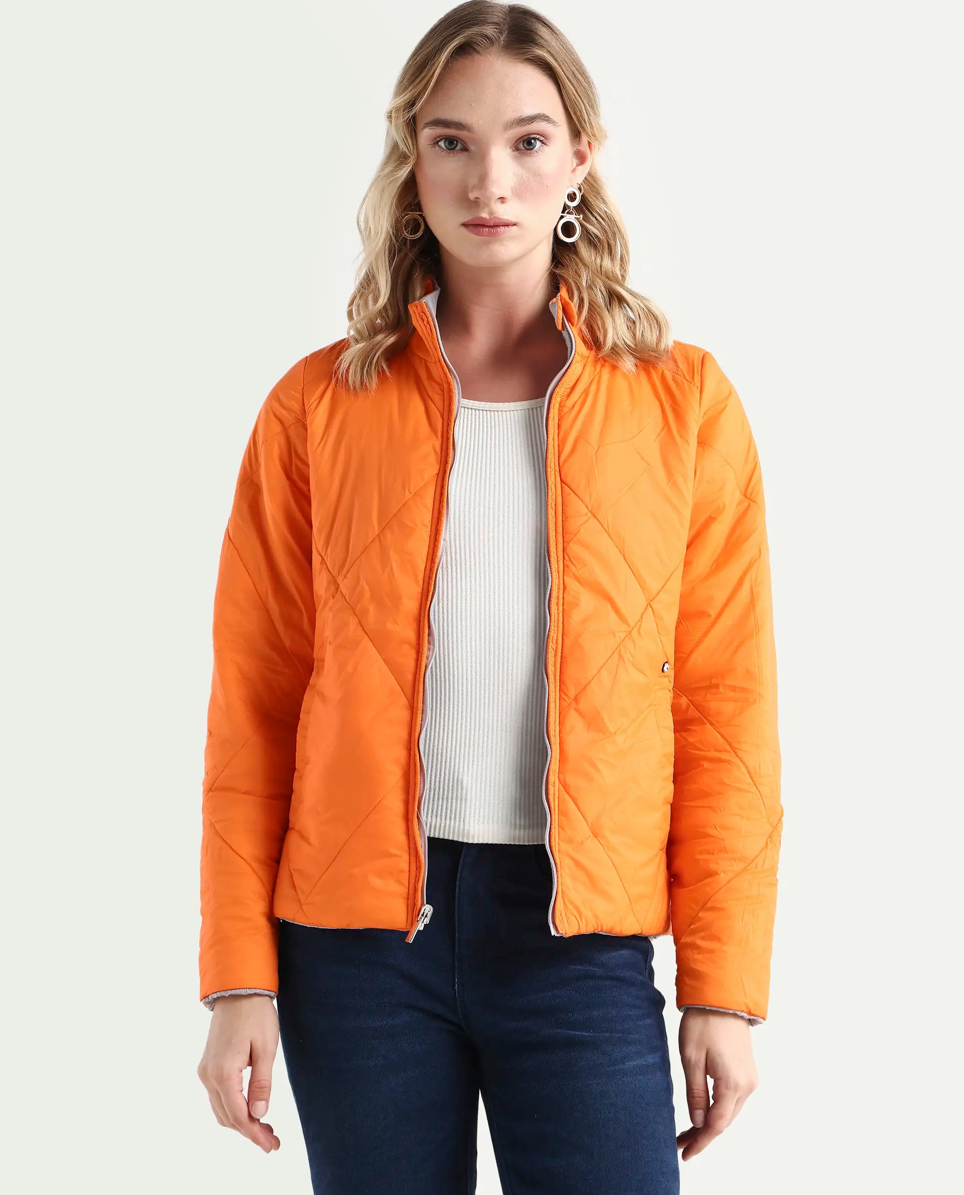 A contemporary style reversible puffer jacket with front zipper closure on the front.